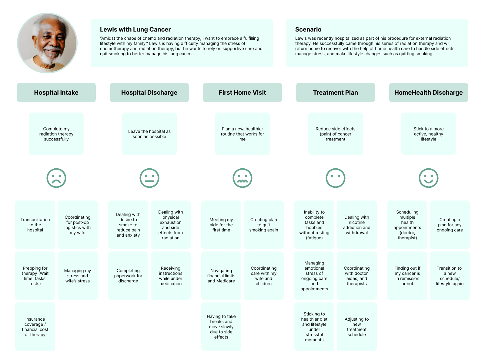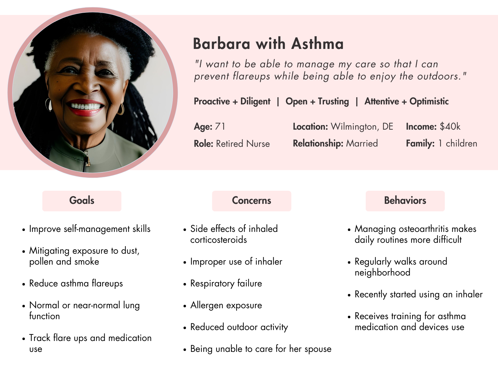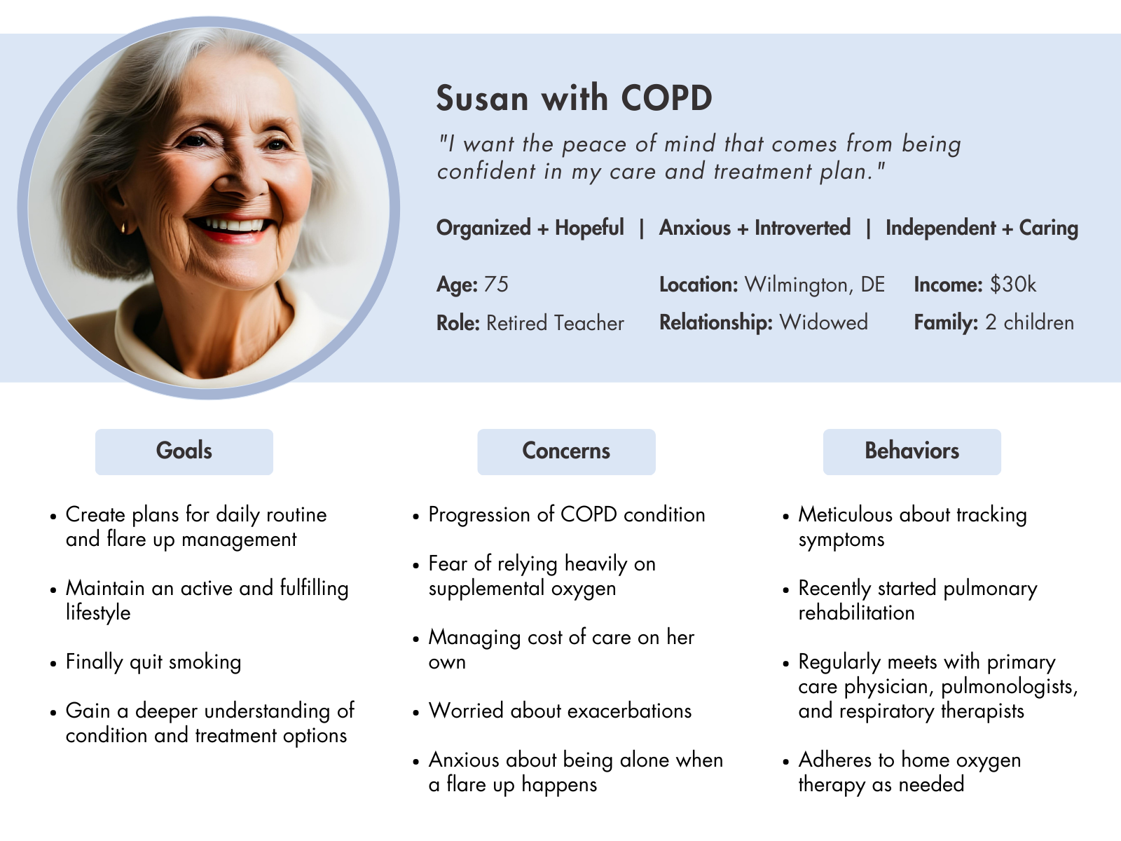 My first step was identifying who our users truly are, beyond their diagnosis. My main goal in data analysis and communication was to ensure that everyone on the project had a shared understanding of who we were creating this product for. I analyzed data from ChristianaCare's HomeHealth program, local Delaware public health datasets, and national reports from the CDC and the U.S. Census. I found that our users had distinct variations from national data with regards to gender, race, and marriage status, which informed a set of 5 personas for each of our focus areas.